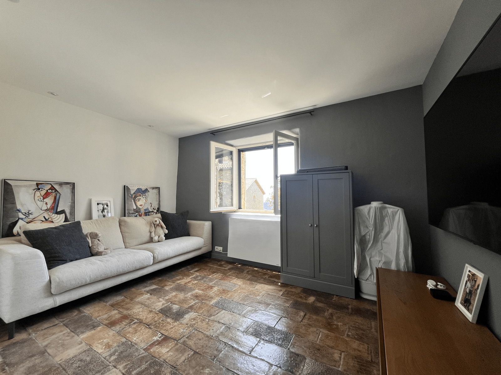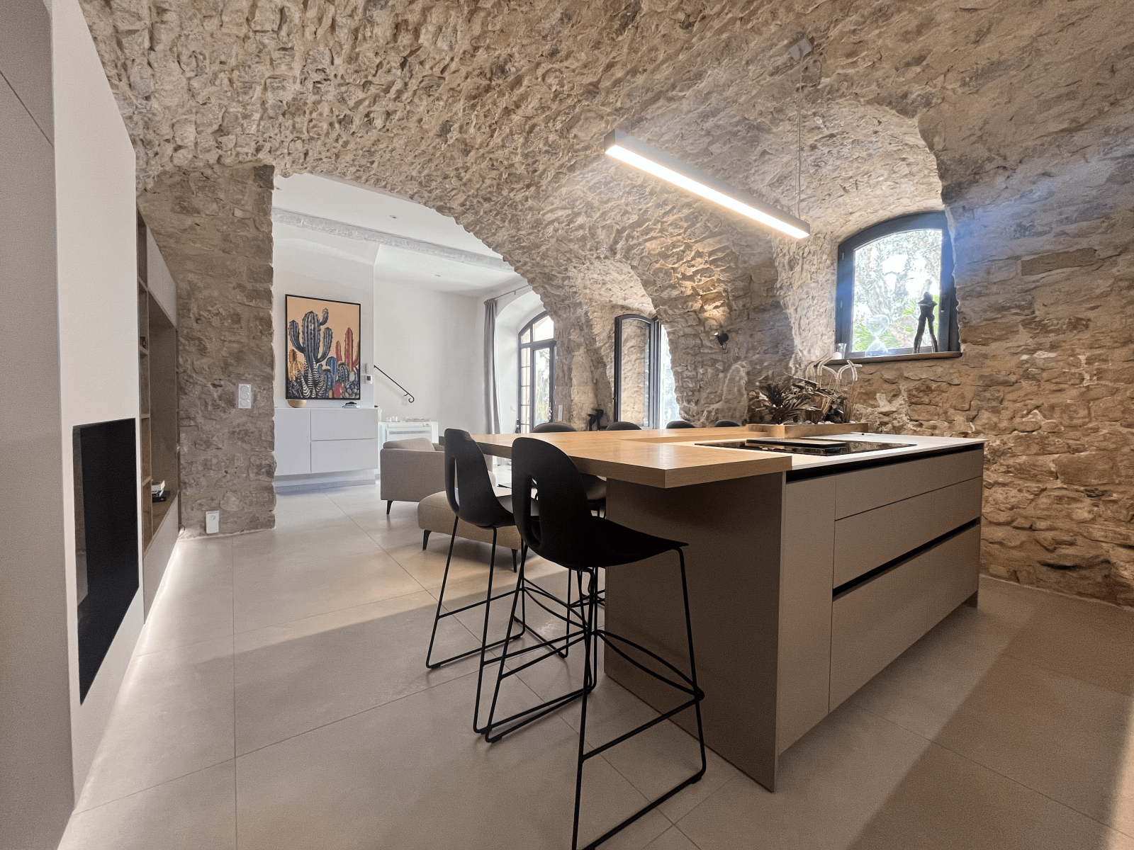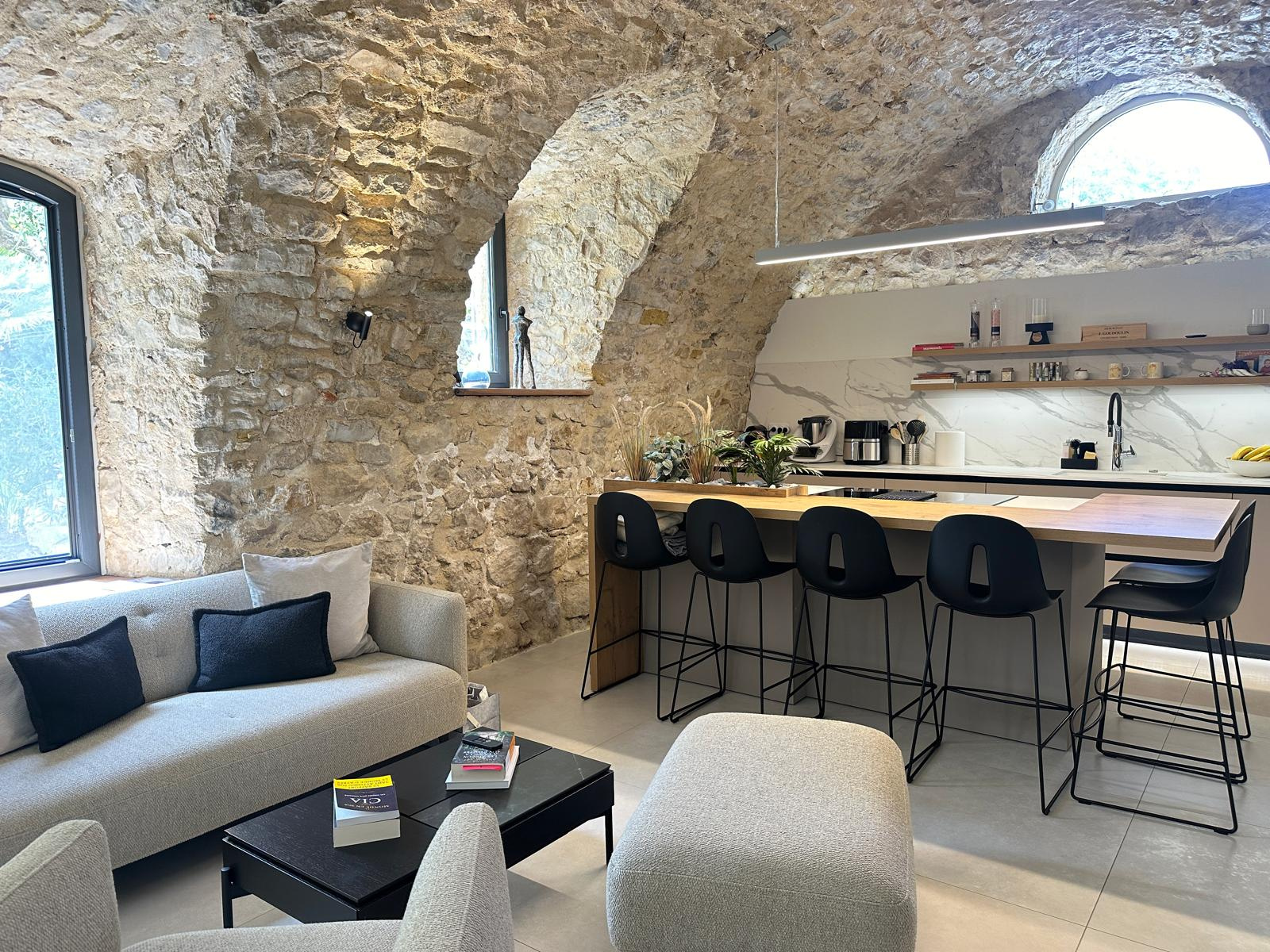 Cabris: 108 m² 5-room terraced stone house dating from 1790, renovated with quality materials, combining old-world charm with modern comforts. Spread over three levels, it boasts a vaulted stone ceiling, highlighting its historic character while offering a contemporary interior.