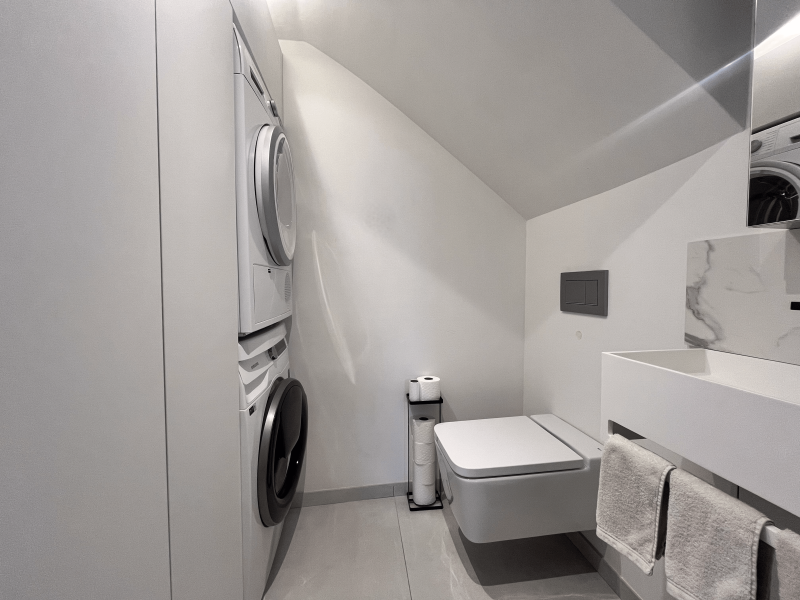 The bright and spacious first floor features a living room with fireplace, a modern open-plan kitchen fully equipped with luxurious finishes, a toilet with washbasin and a laundry area.